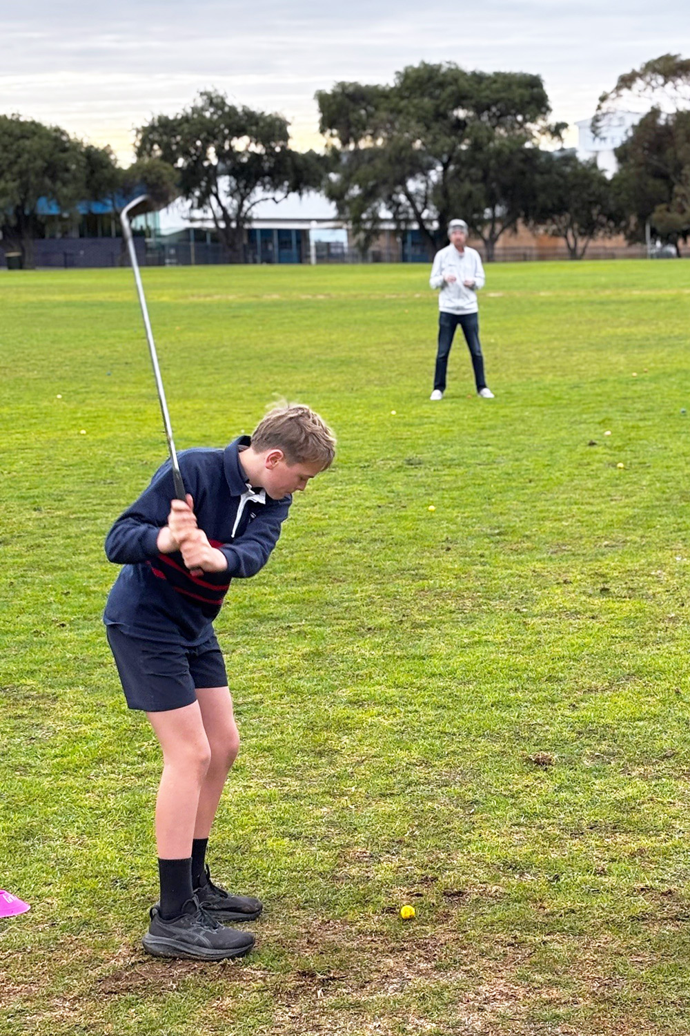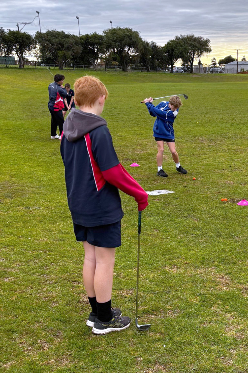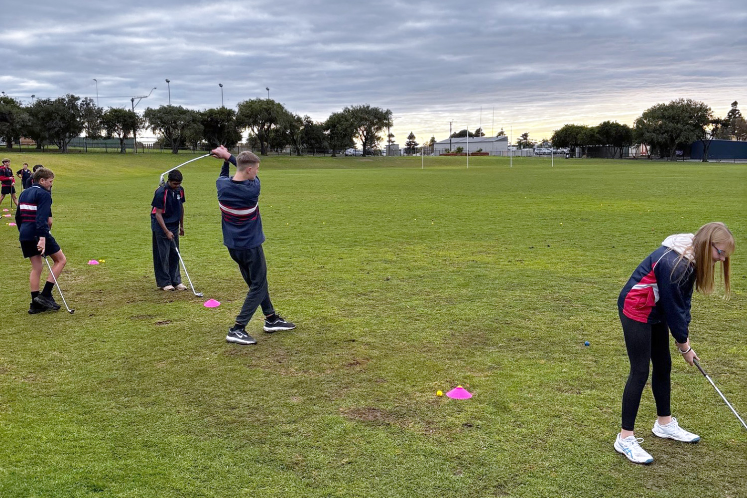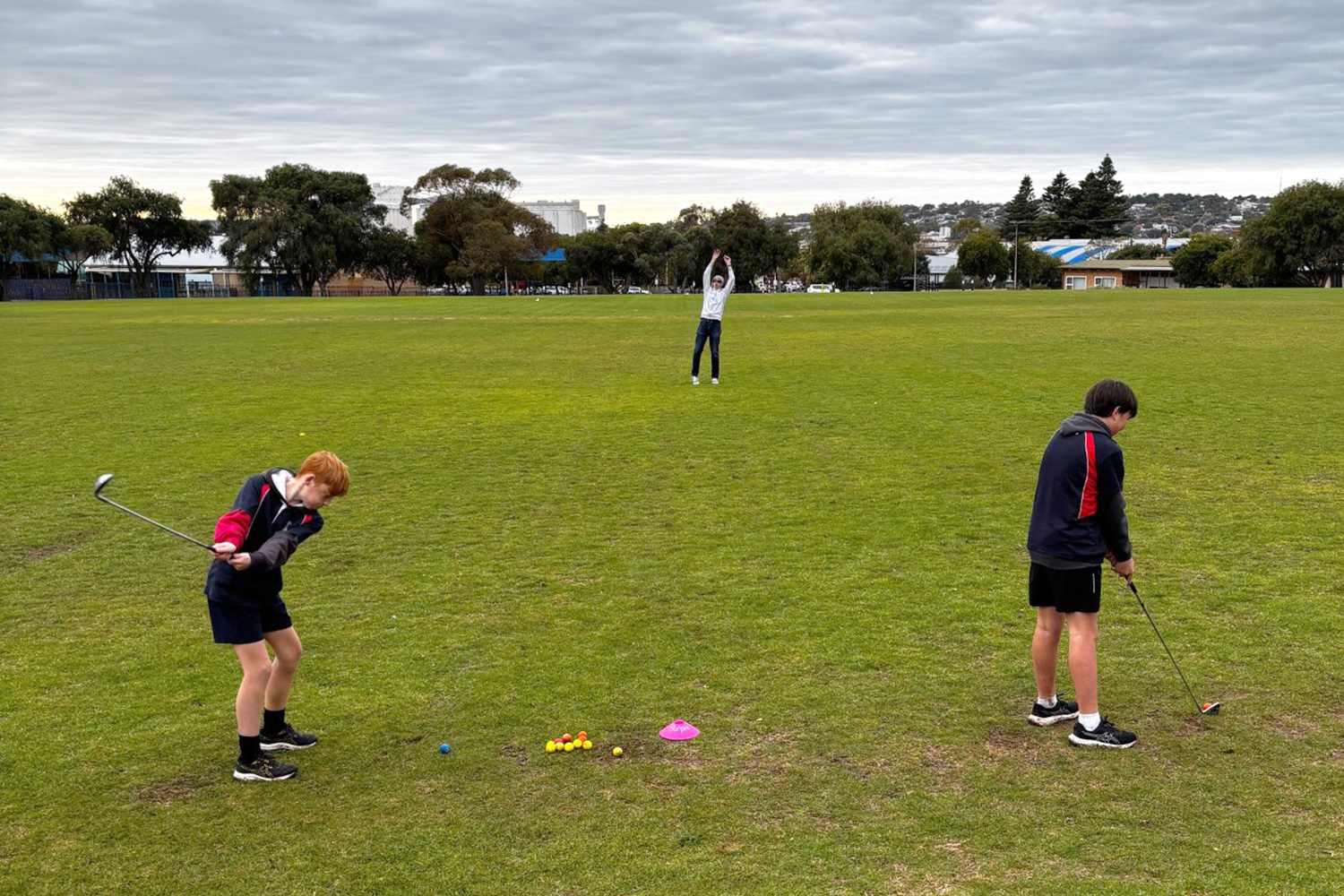 Despite the frosty conditions on the Oval, the twenty eager golfers performed strongly, quickly improving their skills with some basic coaching. Winners of the “Nearest the Teacher” competition were Lacey Cullen (centre) and Nixon McKie (right), while Jobe Nielsen (left) claimed the “Most Improved” prize – they are pictured here with Mr. Shaun Thomas (Activity Leader).
