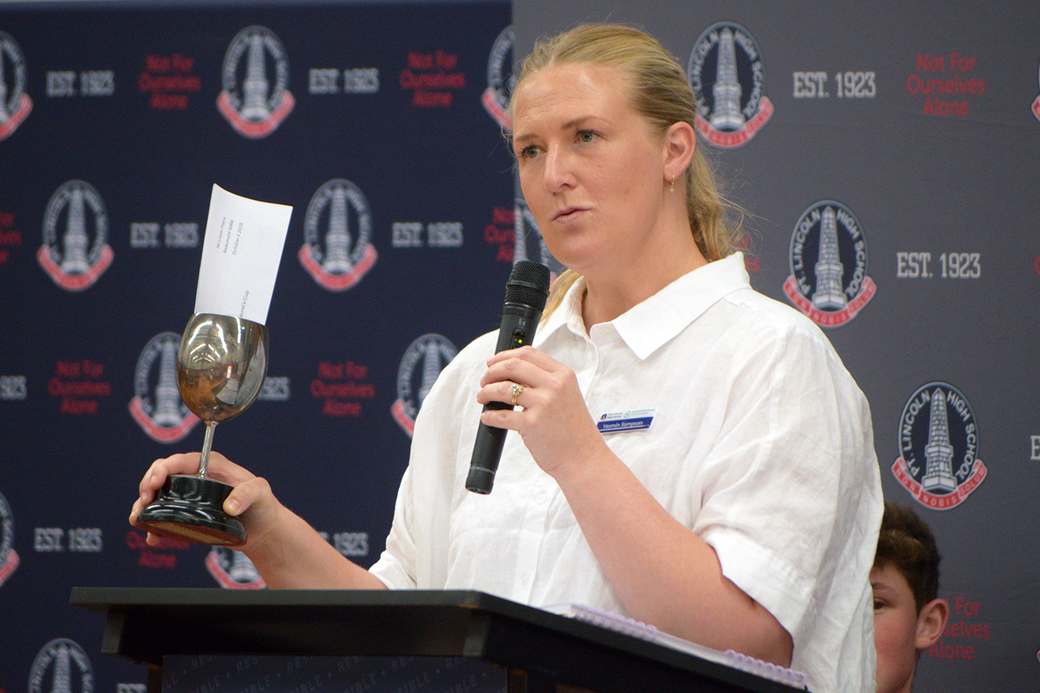 As the organiser of this year’s Sports Day (Tuesday March 3 at Ravendale), Mrs. Yasmin Sampson congratulated the House Leaders on their appointment. She also presented a historic running trophy which was generously donated back to our school last year – the Port Lincoln High School Forbes Cup was originally awarded to Miss Laurel Hookings in 1926. The 100-year-old artefact will be presented again at this year’s Sports Day to a deserving student, underlining our school’s proud sporting tradition.