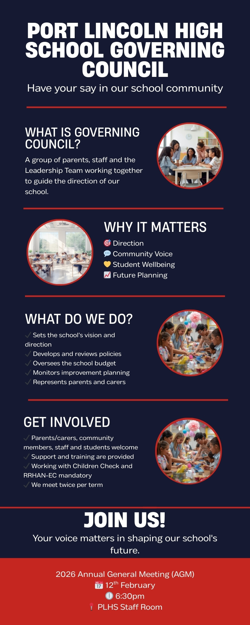 Public education is founded on parent/community voice and decision-making; as the elected parent body, your Governing Council models the school’s motto “Non Nobis Solum” (Not for Ourselves Alone) by working with the school in the interests of learning and pathways for all students.