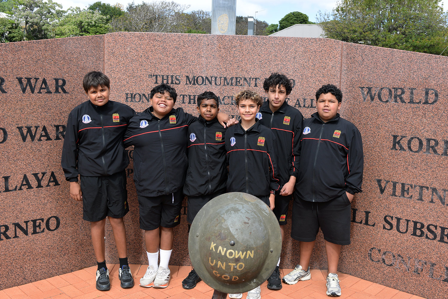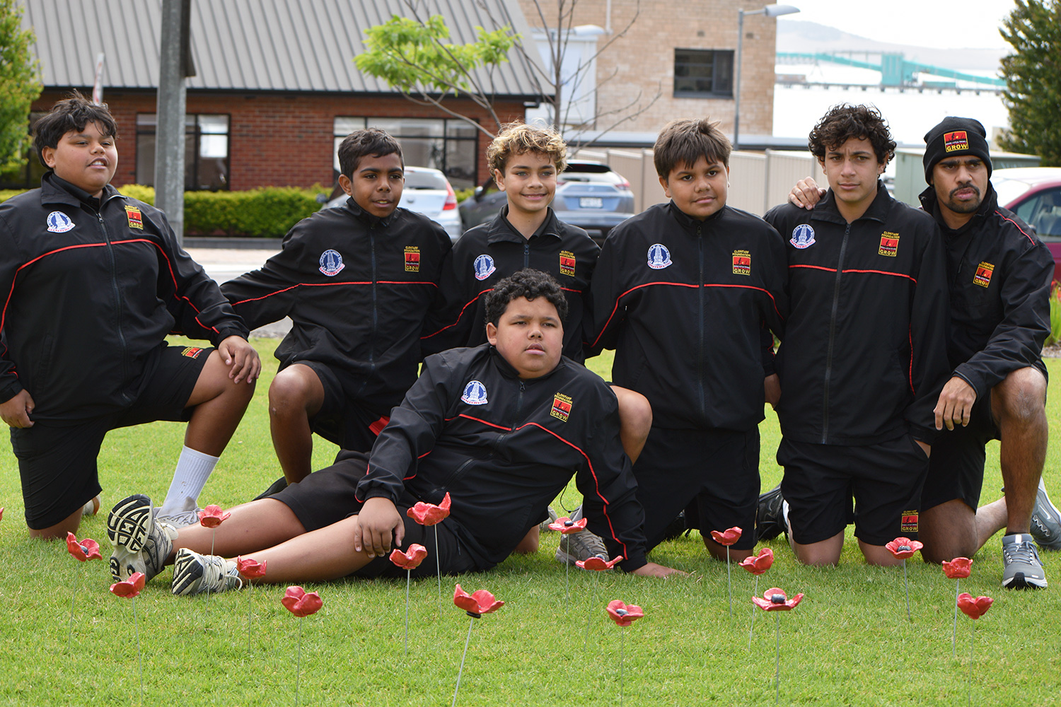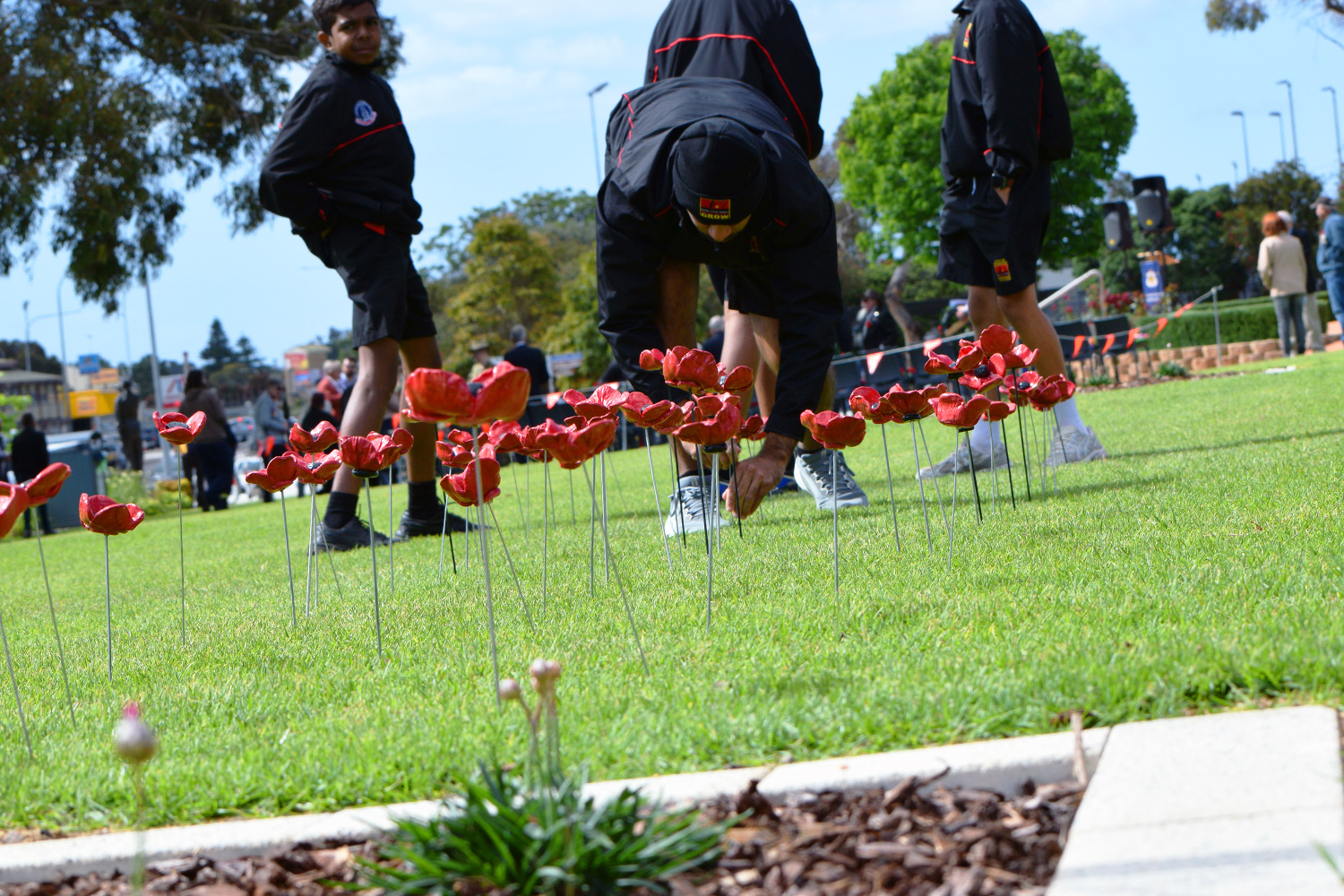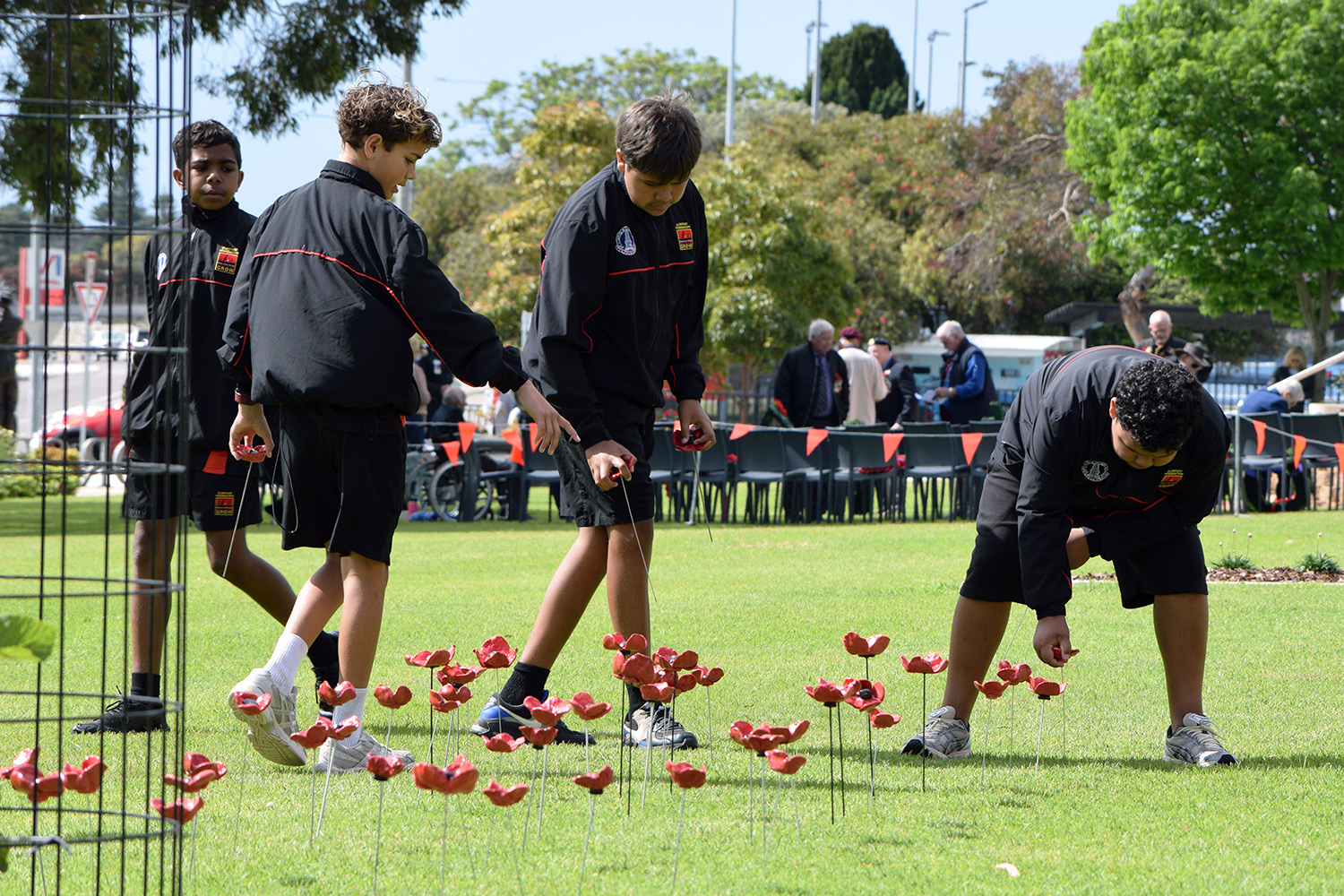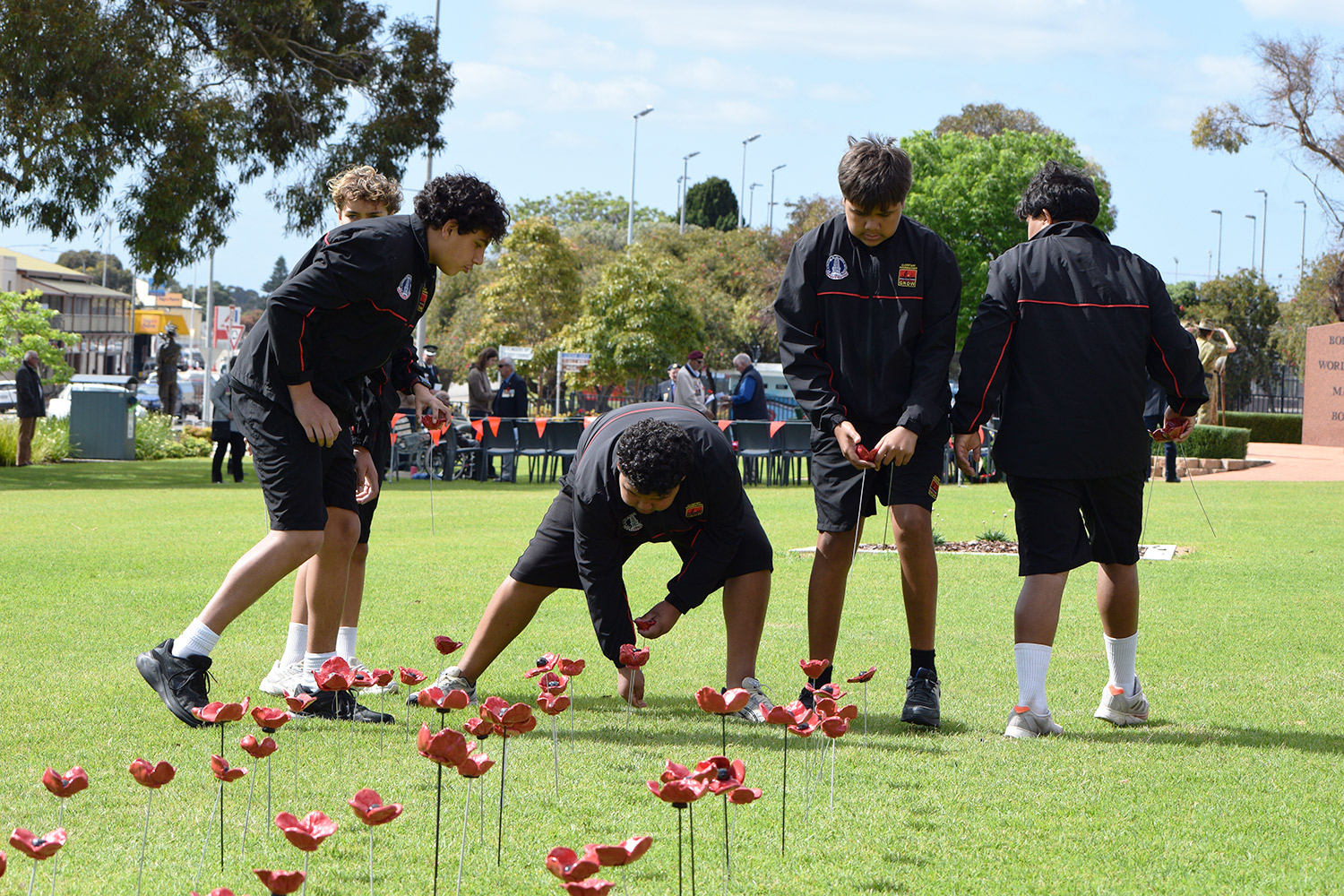 Before the service commenced, six of our Clontarf Academy boys – Scott Kropinyeri, Brody Dunnett, Jase Lennon, Kyson Driver-Roderick, Shadley Coffin and Leo Warrior, accompanied by Operations Officer Mr. Casey Amos – were invited by members of the Port Lincoln RSL to plant a field of ceramic poppies into the Eyre Park lawns.