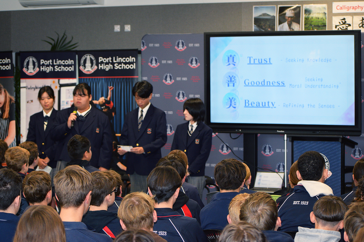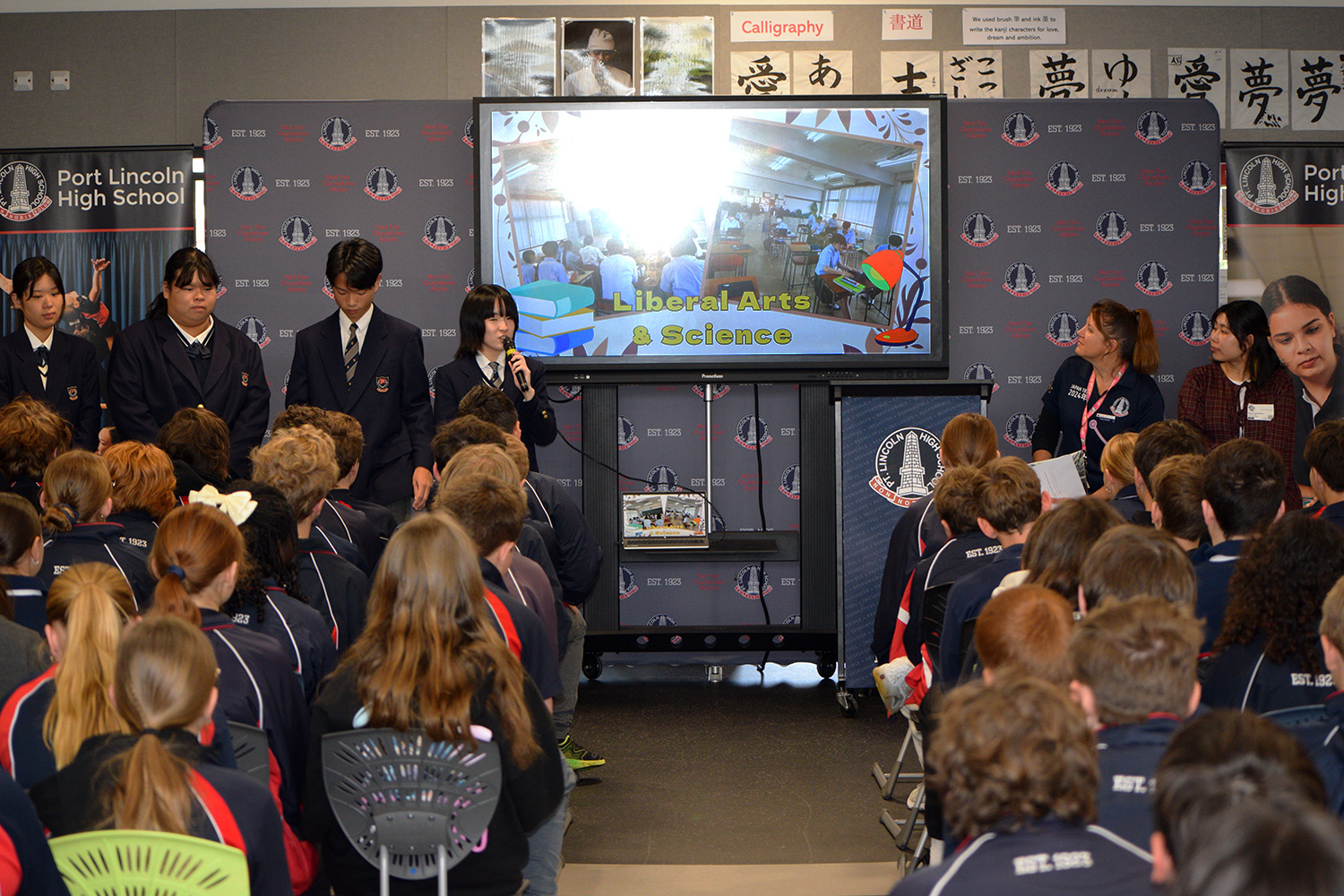 With our Year 7’s, Year 8’s and a select group of Year 11/12 students in the audience, the delegation was officially welcomed to our school via speeches from PLHS Principal Mr. Craig Akehurst and School Captains Sophie Lang and Liam Akehurst – these were skilfully translated into Japanese by Miss Hazuki Yamashita and Year 11 Japanese students Rhy Kayser and Dakota Taferner.