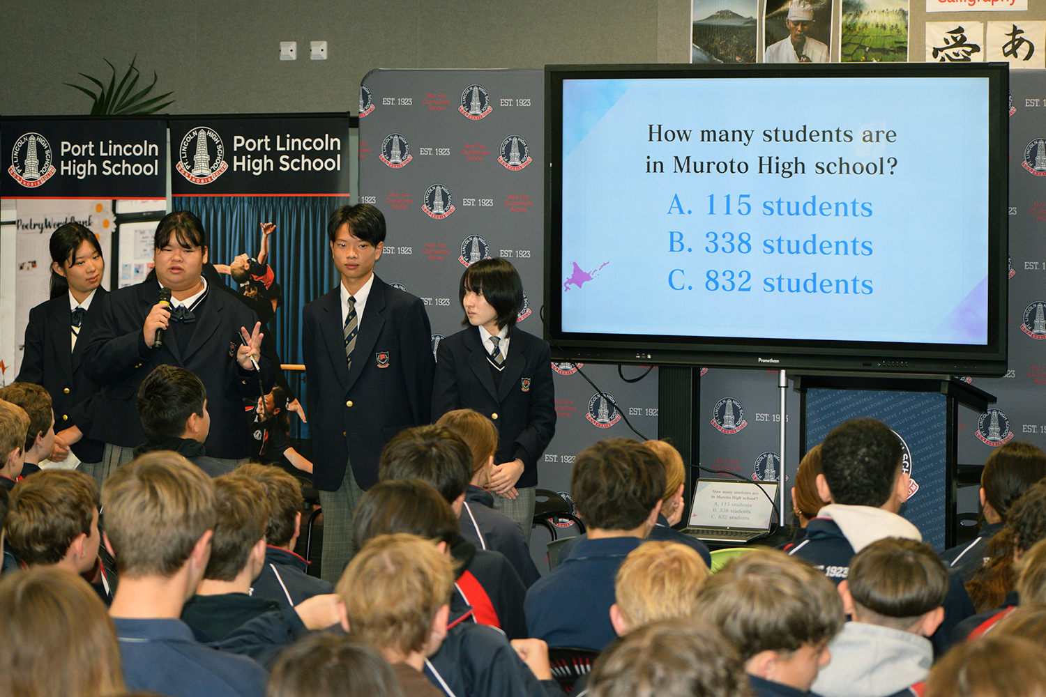 The four Muroto HS students then took centre stage. After introducing themselves, they delivered a thoughtful presentation about their school and nation – this included an interactive quiz for our students and was all spoken in impressive English! Following an official exchange of gifts between the two schools, the ceremony was brought to a close; after being congratulated for their efforts, the very relieved Japanese students were then given a relaxed tour of the PLHS campus by the students in Mr. Akira Inger’s Year 10 Japanese class.