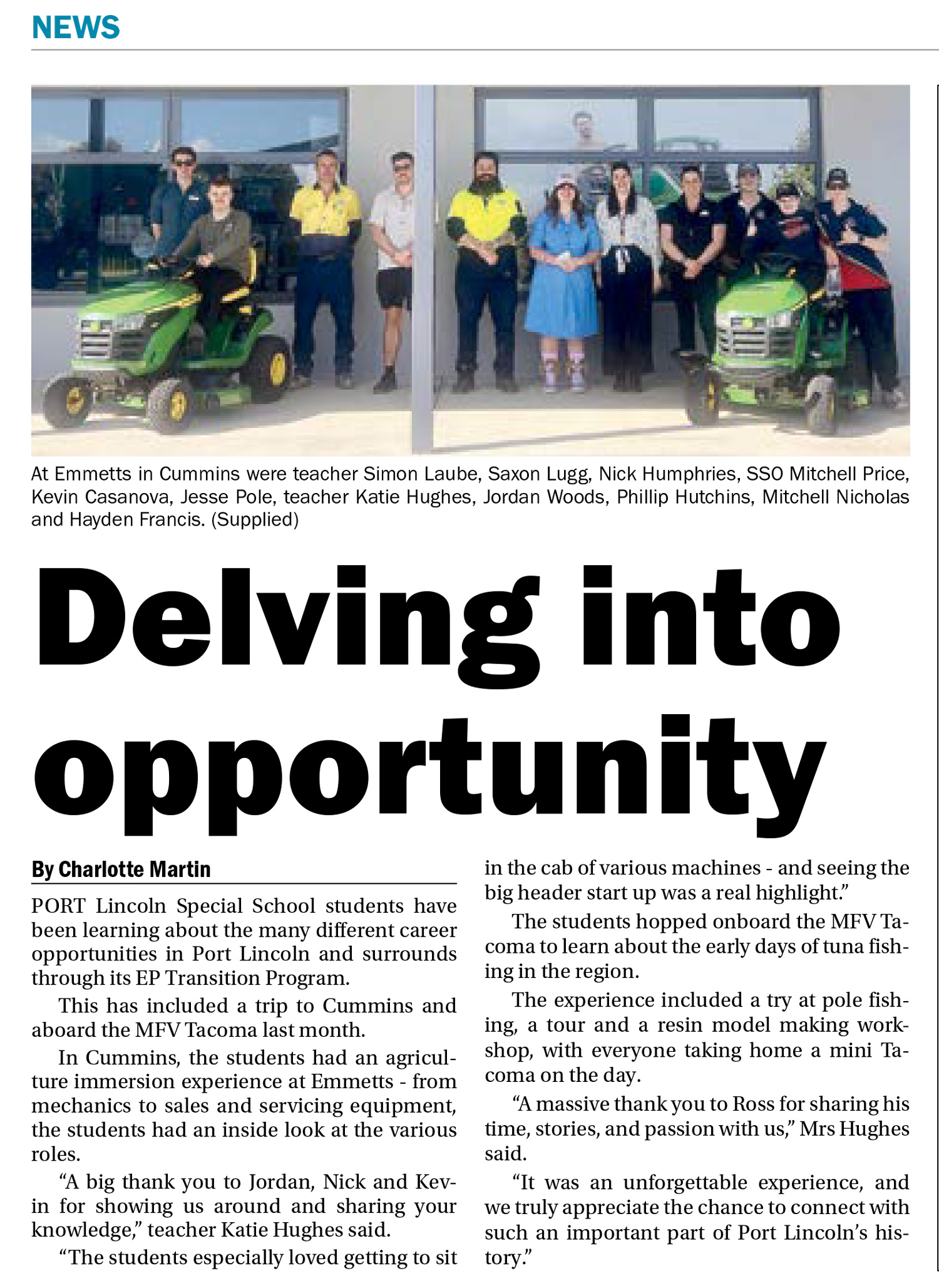 Through this program, students explore a range of career opportunities across the city and beyond. It was a proud moment for these students to be featured on the front page of last week’s Port Lincoln Times!