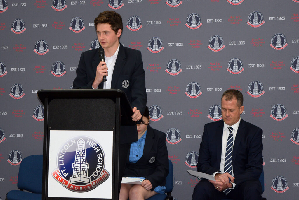 Music students/staff Summer Thorpe (Year 11), Josh Flanigan (Year 10) and Mr. Stephen Campbell provided a real highlight during today’s proceedings, as they skilfully performed two songs for the audience – Green Day’s “Longview” and No Doubt’s “Just a Girl”. We look forward to inviting more students to deliver live music at future whole school events.