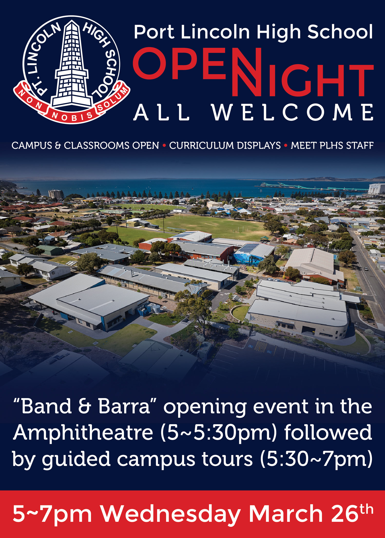 Port Lincoln High School’s first night Open Night for 2025 will occur two weeks from today (Wednesday March 26th from 5~7pm).