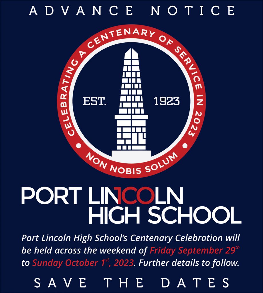 Port Lincoln High School’s Centenary Celebration will be held across the weekend of Friday September 29th to Sunday October 1st, 2023. Further details to follow. Please save the dates.