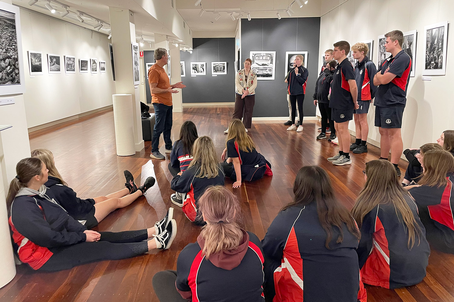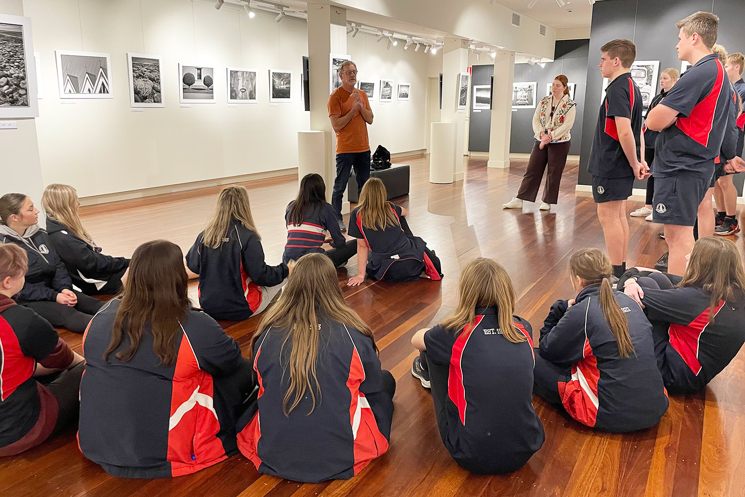 Ross introduced himself to the students, explaining how his photography interest began with graphic design and commercial photography in Melbourne. He explained how this collection – his second exhibition at the Nautilus Arts Centre – concentrates on black and white images so that details can be highlighted, and the viewer can focus on elements other than colour. He strives to capture subjects in the real world in interesting ways.