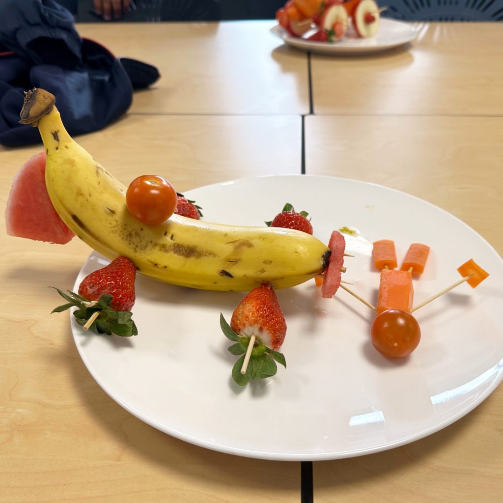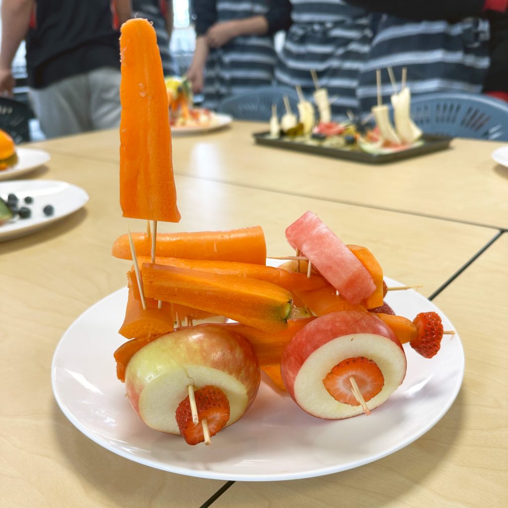 Earlier this week, the Year 8 students in Miss Tayla Helbig’s HPE class attempted their first food practical – they were challenged to produce artistic creations (of recognisable objects) using only fruit.