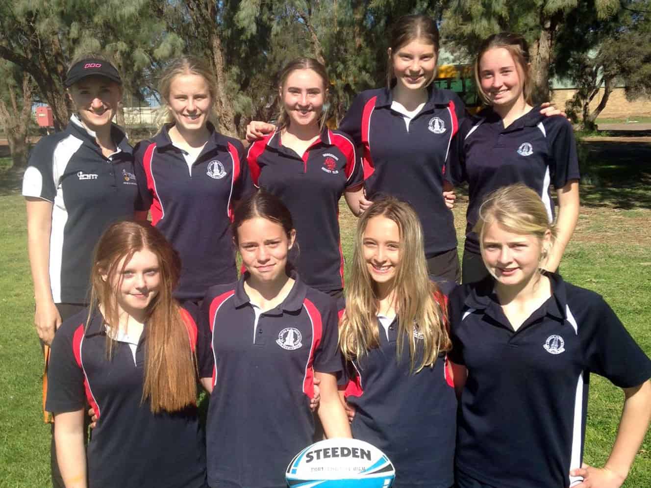 GIRLS TEAM PHOTO CAPTION: Back row (L-R): Ms Jasmine Woldt (Teacher/Coach), Imogen McGown, Claire Wilks, Mardia Enge & Tayah Kruger. Front row (L-R): Monique Rayfield, Tahlia Scholz, Makaya Bryant & Nell Cane.