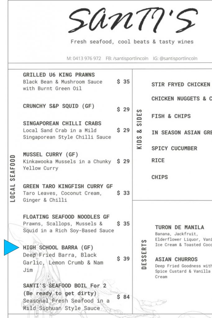 This was brought to our attention this morning – it popped up in the Facebook feed of one of our staff members. Patrons at Santi’s can now order “HIGH SCHOOL BARRA”, as supplied by Mr. Chris McGown and our Aquaculture students.