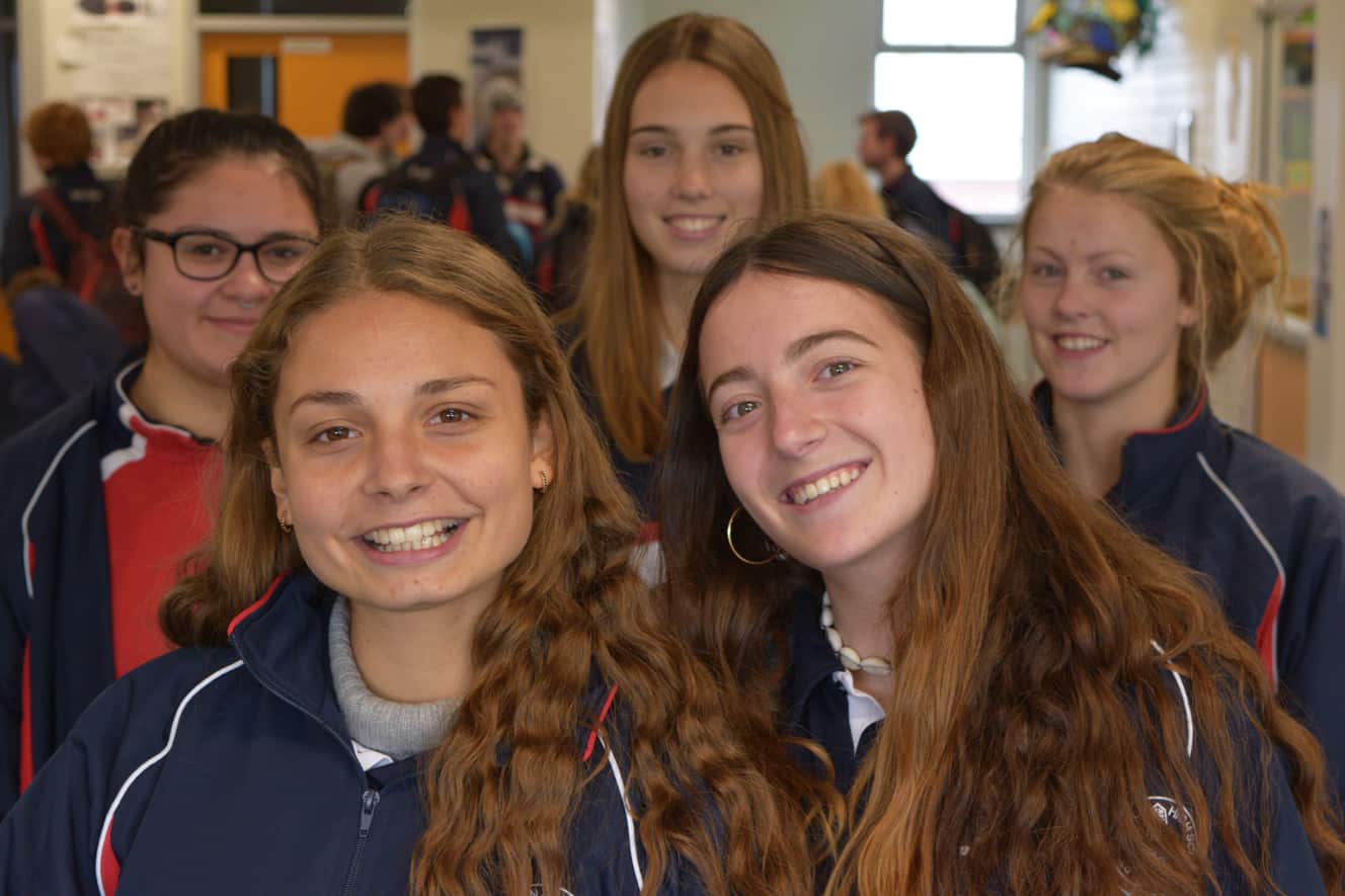 Above: Italian Sofia Roveri (front left) and Spaniard Ana Vidal Marti (front right) with their new “Aussie mates” (back L-R) Paola Alejos Padilla, Anastasia Scholz and Jesika Cane.