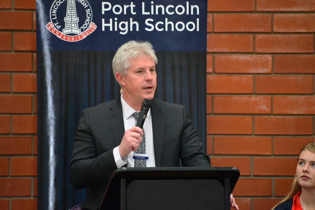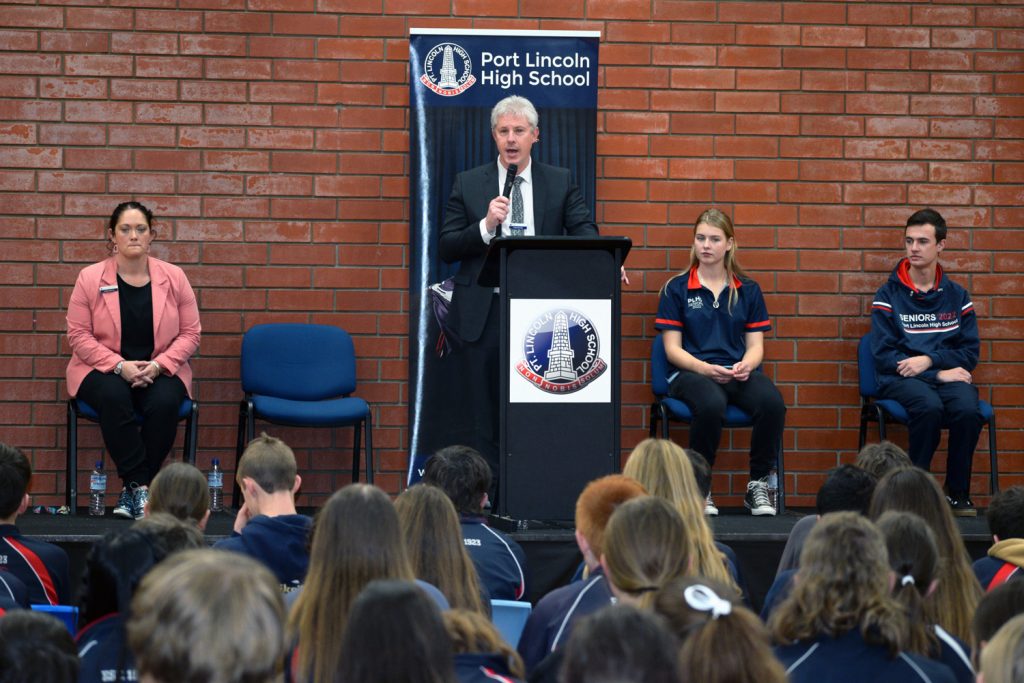 The stage party also included PLHS Principal Mr Todd George – who delivered a wide-ranging address to the students – and 2022 Principal Student Leaders Nell Cane and Mitchell Paterson.