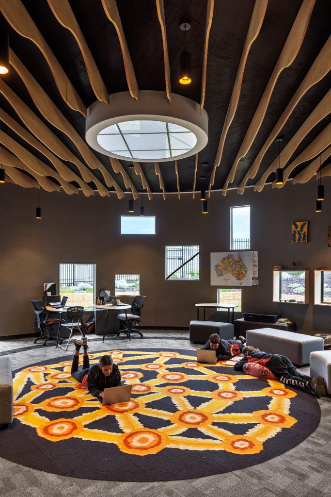 The designers drew upon the circle for its cultural significance to First Nations stakeholders, using it as inspiration for the Aboriginal Education room. The curve motif was beyond interior finishes to a curved masonry façade, considered an important element in the design despite the added cost. The curved corner masonry signals to the street: this is a place of welcome and intention. As architects, we advocated to retain this design gesture, despite its expense; the curved façade demonstrates a lasting generosity towards First Nations education on site. Indoors, we incorporated student artwork into a circular carpet feature, utilising Indigenous student talents in a way that builds ownership of the space.