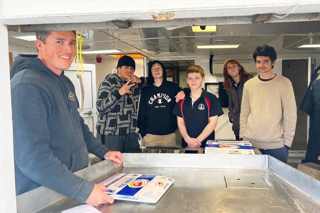 The highlight of the visit was a tour onboard Ashley’s prawn boat – the Lunar Sea – where students were able to see first-hand how a prawn vessel and fishing crew operate at sea. Ashley described in detail how the fishing gear worked, how the prawns were processed on board (including grading, cooking, packaging and freezing). He also gave our students a tour of his wheelhouse where he demonstrated how he uses technology to drive and navigate the boat, as well as find prawns to catch!