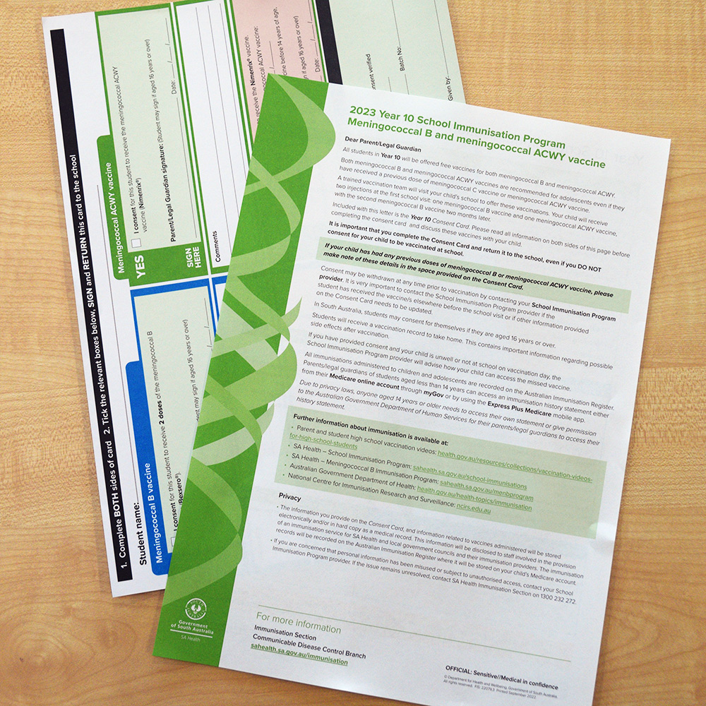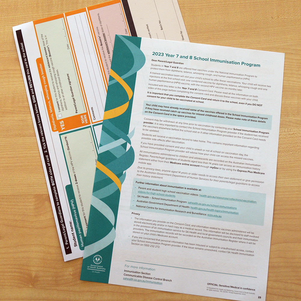 Immunisation Consent Packs have been sent home with all Year 7, 8 and 10 students. It is important that you read the information contained in the packs before you give consent for your child to be vaccinated at school. If you have any questions about this program, please contact SA Health.