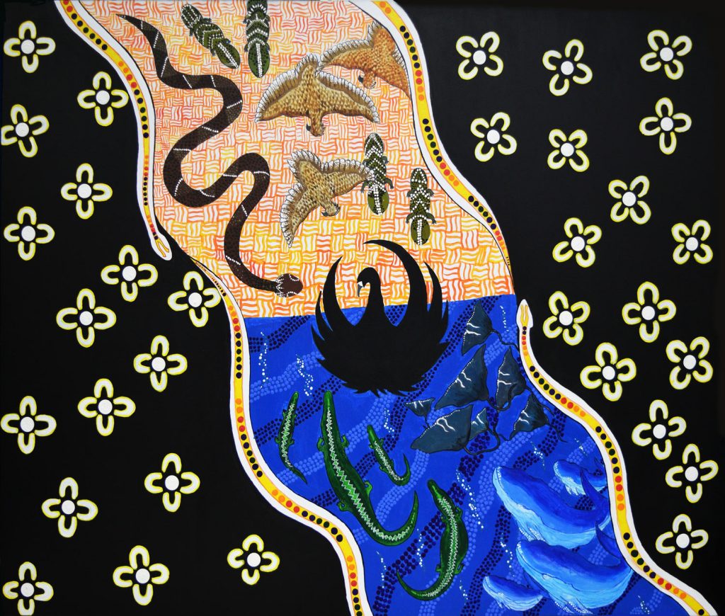 “The theme for this year’s Power Cup is Tarrkarri. In the language of the Kaurna people, Tarrkarri means ‘the future’ and symbolises the setting of strong foundations for the Centre and where the Centre is located on the Adelaide Plains. We have incorporated this theme within our design as we have implemented the language totems of members of our academy all moving together in unity guided and connected by two Rainbow Serpents. Our group is moving towards a Black Swan at the centre which represents the totem of the Kaurna People and symbolises the Tarrkarri theme. Our design represents our journey to Kaurna land for the Power Cup but highlights that no matter what group we come from or how we differ, our academy remains connected.”