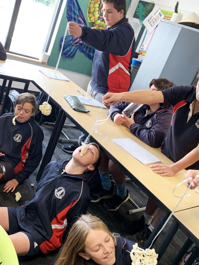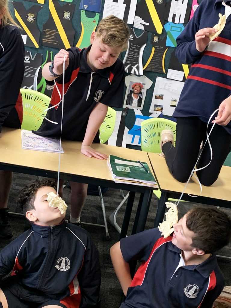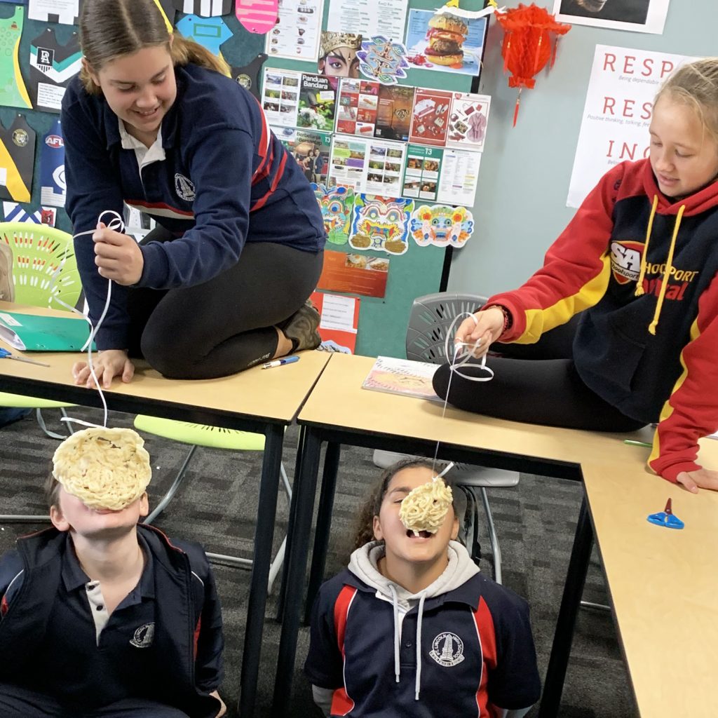 The students designed and made their own celebration Penjors, fondly referred to as Balinese Christmas trees, which they tied to the entrance of the Specialist Building. The Year 9’s cooked up a feast of lumpia (spring rolls) and kue kelapa (coconut pudding), while the Year &’s and 8’s tried (and loved) a traditional Indonesian snack of nasi putih, krupuk singkong, krupuk bawang, ketimun and kecap manis. Finally, they tried the traditional eating competition game of Krupuk Mie, which was fun but messy!
