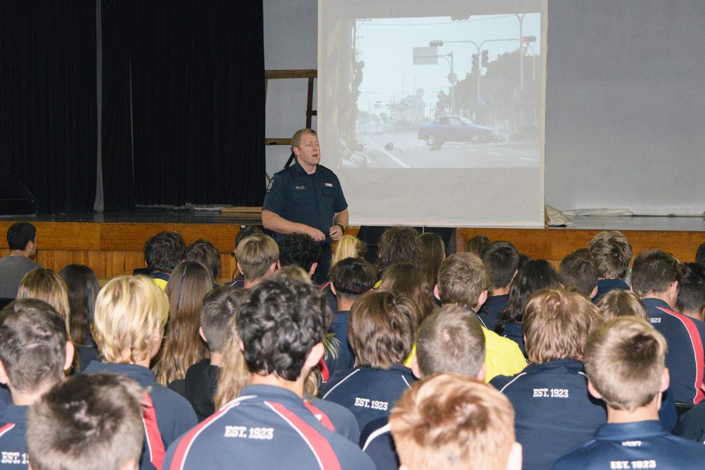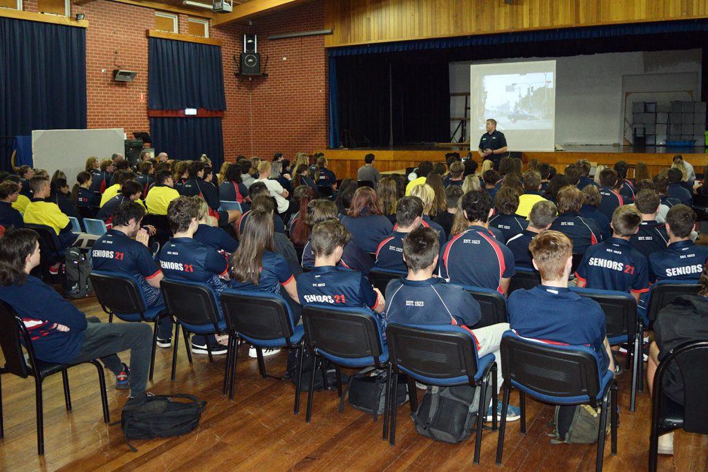 Earlier today, our Year 11 and 12 students attended an important Road Awareness Program education session in the Hall. Entitled “Looking After Our Mates”, the informative, thought-provoking and often confronting seminar is an initiative of the Metropolitan Fire Service.