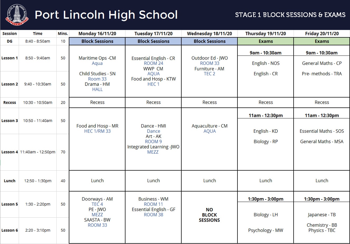 Stage 1 Block Session & Exam Schedule (Wk 6)