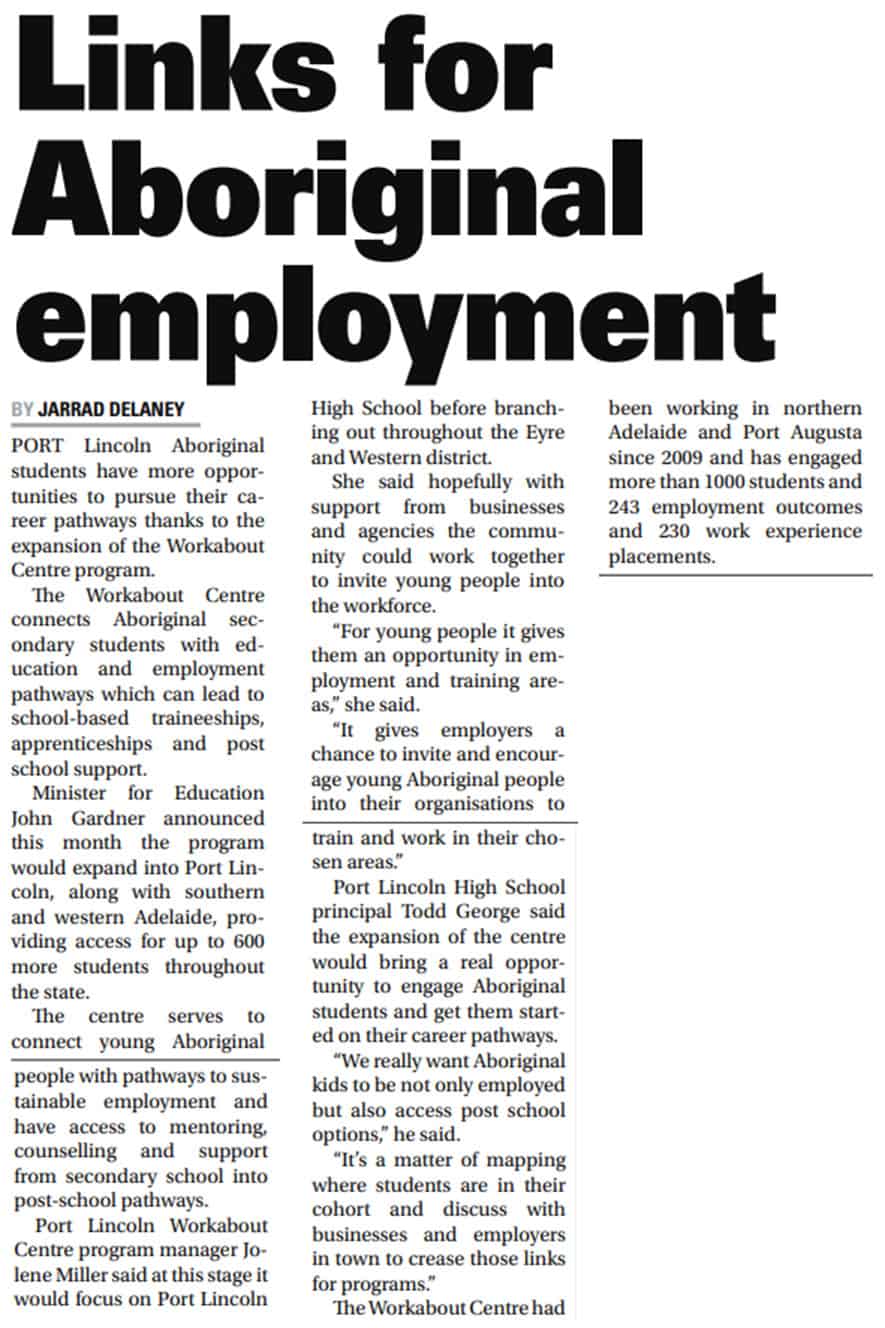 The Workabout Centre program connects Aboriginal secondary students with education and employment pathways which can lead to school-based traineeships, apprenticeships and post school support. Last month, Minister for Education Mr John Gardner MP announced that the scheme would expand into Port Lincoln.